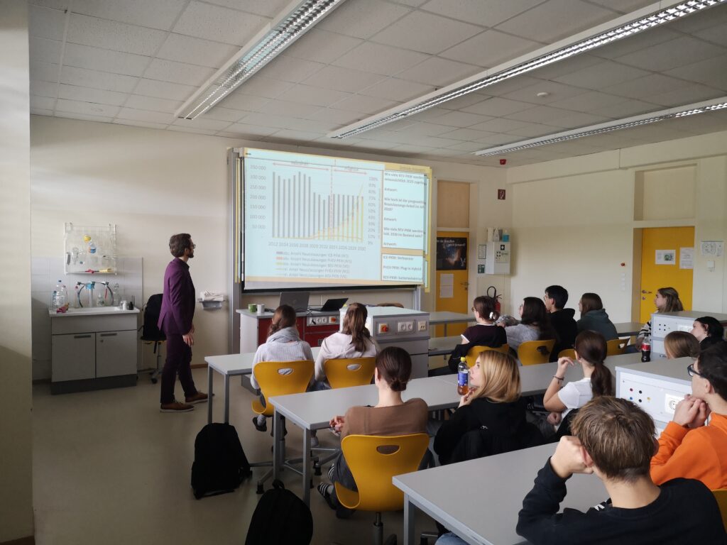 In kurzweiligen drei Unterrichtsstunden spannte Herr Wieser einen Bogen von der Technik elektrisch betriebener Fahrzeuge und Energieaspekten bis hin zu Politik und politischen Rahmenbedingungen. Dabei gab er den Schülerinnen und Schülern einen Einblick in seine abwechslungsreiche Tätigkeit als Leiter von OLÉ, der offiziellen Stelle in Österreich, die die Koordination von Aktivitäten betreffend die Elektromobilität und Großteils die Infrastruktur- und Förderungsagenden in diesem Bereich übernimmt.