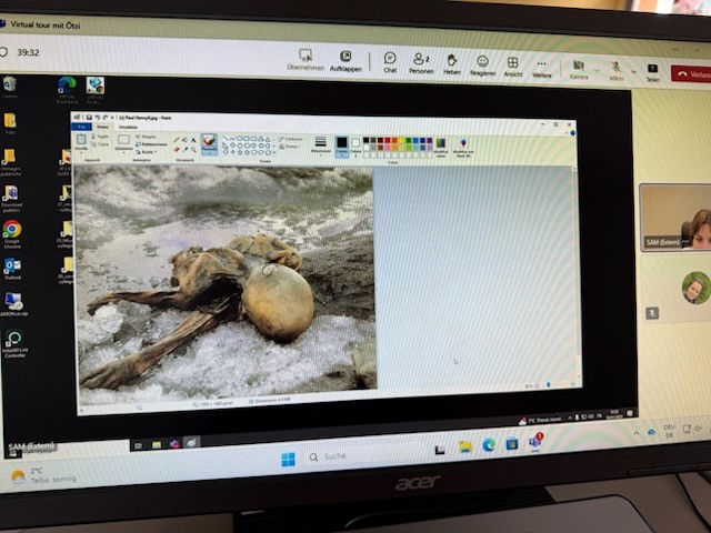 Am 30. Januar 2025 erlebte die Klasse 2B eine ganz besondere Geschichtsstunde: Eine Wissenschaftlerin des Südtiroler Archäologiemuseums in Bozen besuchte das Klassenzimmer, wenn auch nur digital. Per Videokonferenz führte sie die Schülerinnen und Schüler mittels einer virtuellen Tour durch das berühmte Ötzi -Museum und gewährte spannende Einblicke in das Leben der über 5.000 Jahre alten Gletschermumie.